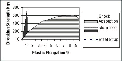 圖表顯示出STRAP 2000相對(duì)于鋼質(zhì)打包帶的優(yōu)點(diǎn)。陰影部分表示打包帶在各自斷裂前可以吸收的沖擊能量。在不斷裂的情況下纖維帶可以比鋼質(zhì)打包帶吸收更大量的沖擊能量。