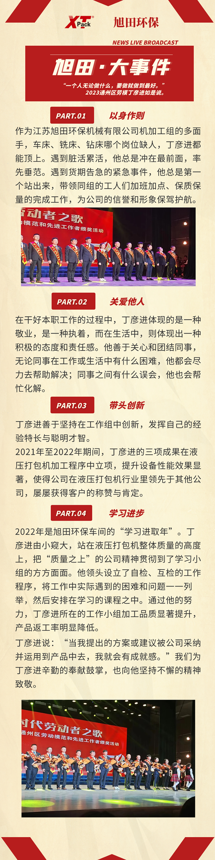 旭田環(huán)保員工丁彥進榮獲2023年通州區(qū)勞動模范稱號