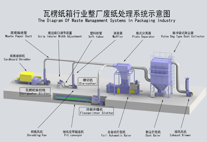 該系統(tǒng)是專業(yè)為瓦楞紙箱行業(yè)設(shè)計(jì)的整廠廢紙?zhí)幚矸桨浮M呔清廢部分由碎紙風(fēng)機(jī),通過不銹鋼金屬軟管將瓦線修邊的兩條紙邊吸進(jìn)風(fēng)機(jī),切斷后通過管道輸送到旋風(fēng)分離器落入廢紙打包機(jī);印刷開槽機(jī)、模切機(jī)產(chǎn)生的廢料則由安裝在地溝內(nèi)的皮帶輸送機(jī)將廢紙輸送至碎紙風(fēng)機(jī),切斷后通過管道輸送到旋風(fēng)分離器落入廢紙打包機(jī),也可以通過皮帶輸送機(jī)直接將廢料送至廢紙打包機(jī);報(bào)廢的紙板或紙箱由紙板破碎機(jī)破碎后經(jīng)碎紙風(fēng)機(jī)吹送到管道再到旋風(fēng)分離器,最后所有廢料都進(jìn)入到廢紙打包機(jī)進(jìn)行壓縮打包;后套的除塵系統(tǒng)則大大降低了灰塵的排放,也可將過濾后干凈的空氣再次排放到車間內(nèi)。